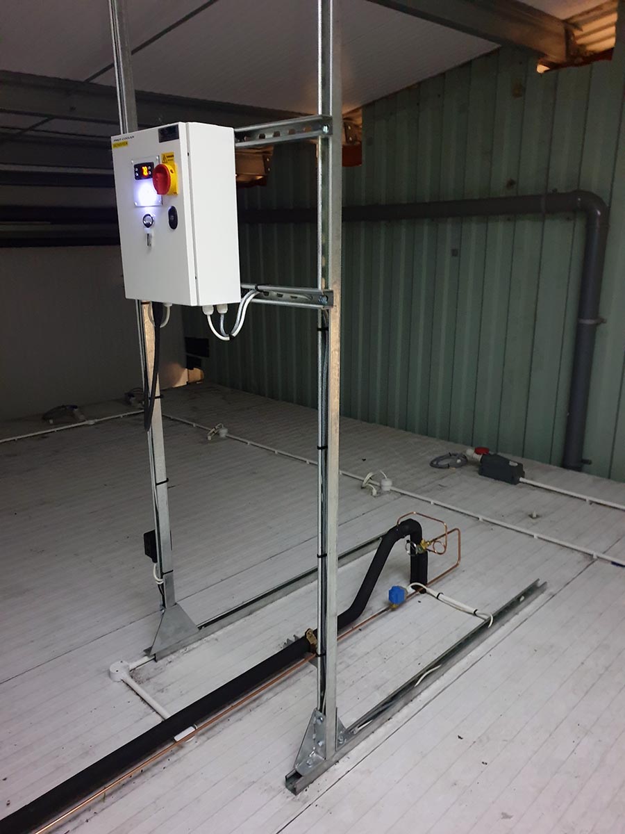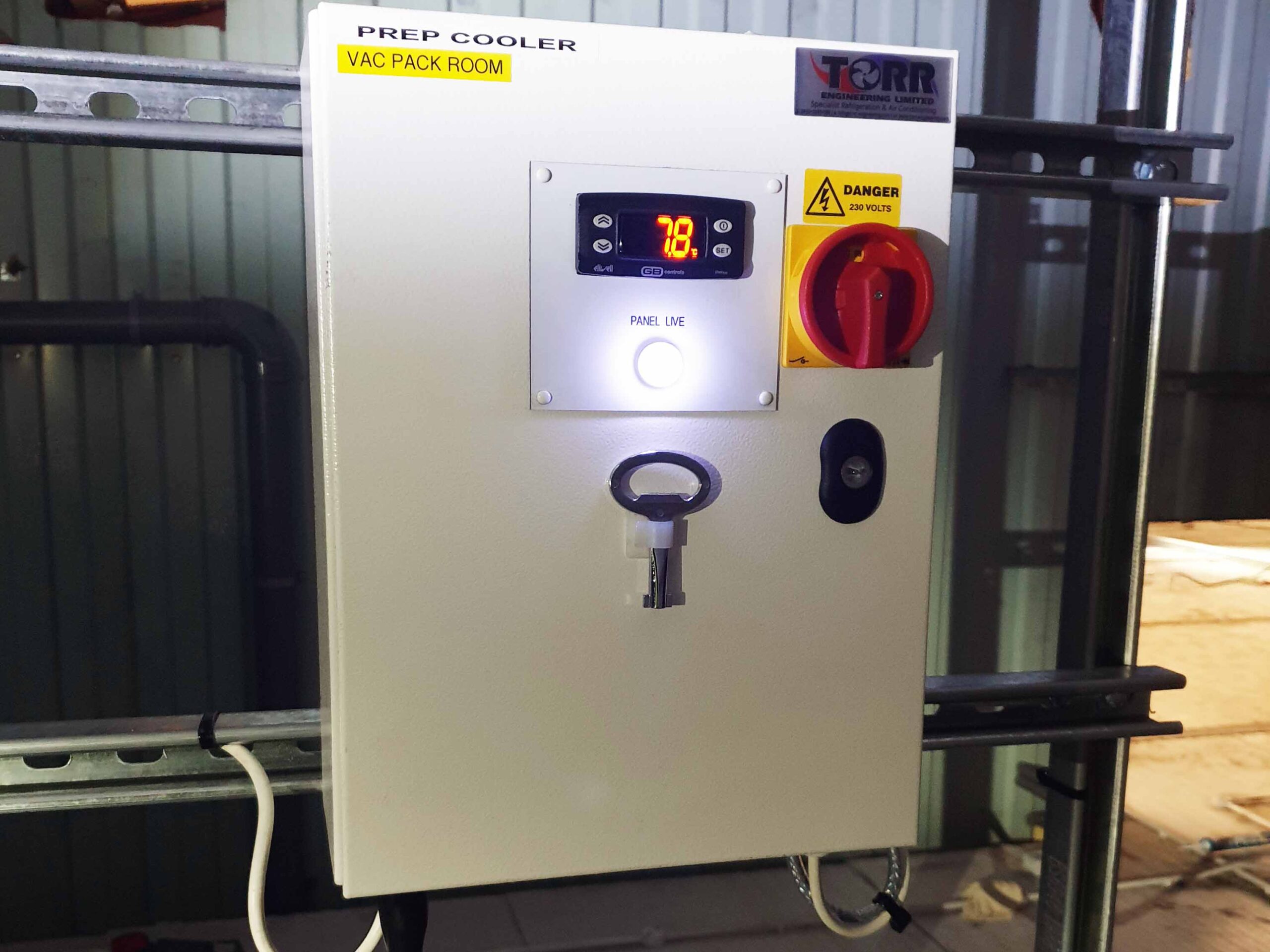 The Cold Room Control Panel would normally be located on the outside front of the cold room, but this area was a very clean environment that was jet washed daily. To prevent the risk of electric shock or damaging the panel, the panel was mounted on top of the cold room with simple on / off isolator operation from within the room.
