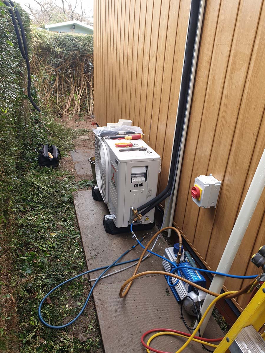 The outdoor condensing unit is installed to the rear of the building, mounted on heavy, high density rubber feet to keep it off the ground and free of debris. Once the pipe work is complete it is pressure strength & leak tested with oxygen free nitrogen.