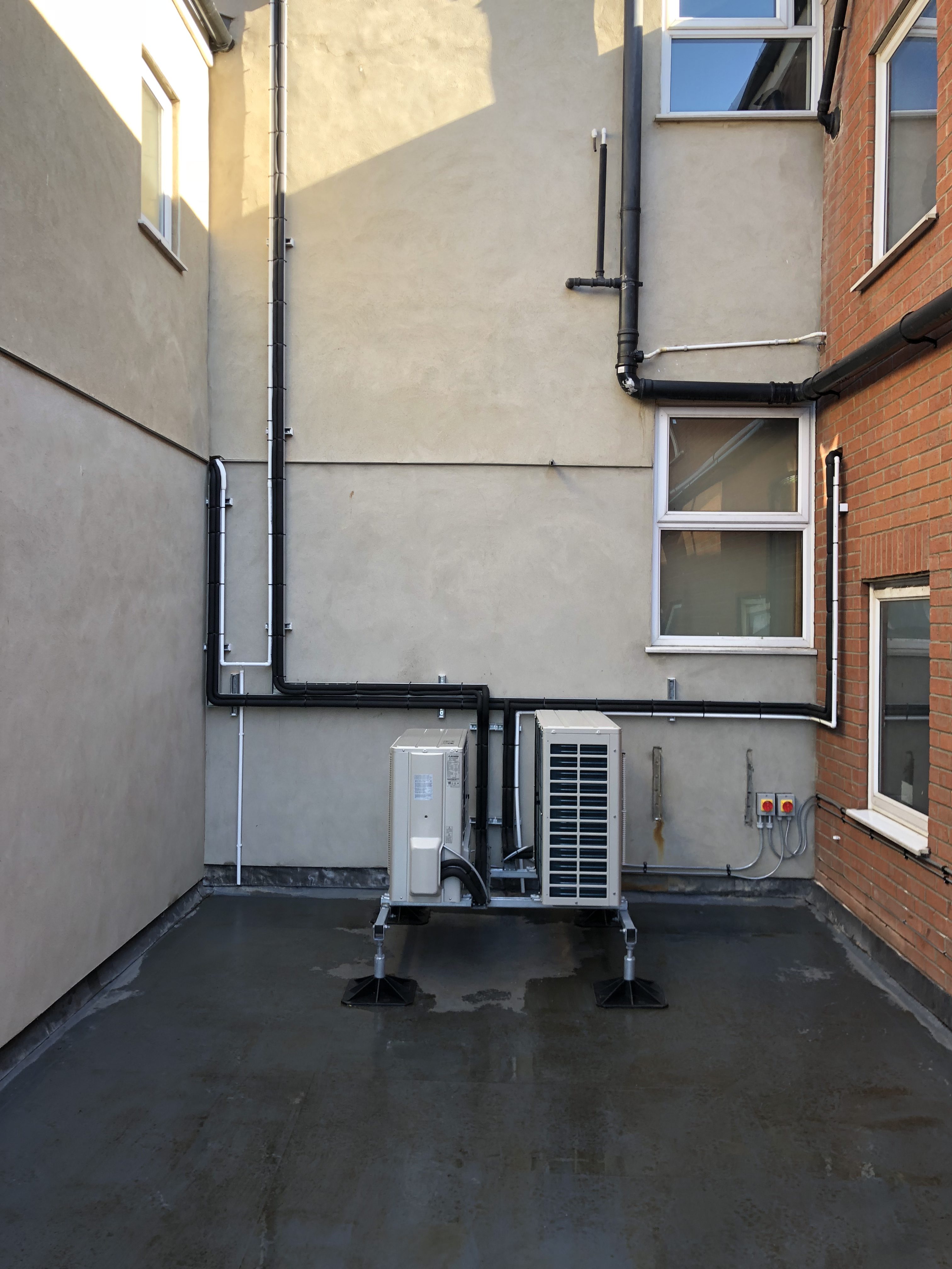 The new Mitsubishi indoor units were mounted on the internal walls of the restaurant & function room, with all services (pipework & cabling) exiting directly behind the units through the wall and out to the flat roof area. This allows for a clean aesthetic inside the restaurant with nothing except the units themselves visible.